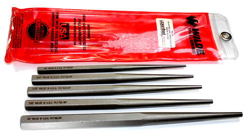 ***SPECIAL OVERSTOCK PRICING*** We had an overseas customer cancel an order for over 50 of these kits, so now we have too many in stock! We have discounted the price over 25% and until we sell the overstock quantity, you can buy this kit for only $34.95 - you save $12! This special price is only good for our overstock quantity on hand and once we sell these, the price will go back to the normal price of $46.95. This extra long tapered punch kit includes one each of the following: 1/8" (8" long), 5/32" (8-1/2" long), 3/16" (9" long), 7/32" (9-1/2" long), and 1/4 (11" long). Vinyl storage pouch included. Made in the USA!