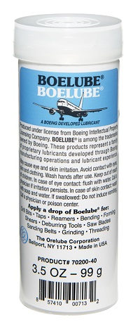 Developed by Boeing, BOELUBE® is great for drilling, reaming and cutting operations. Will extend cutting tool life. Non-toxic, works with metals, plastics, and graphite. Easy to use push-up tube. (Mfr. model # 70200-40) BOELUBE is made in the USA! Order Part # BOE-002 3.5 oz Push-Up Tube