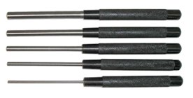 Features knurled handles for easy grip. 8" overall length - punch portion is 3-1/2" long. Includes sizes 1/8", 3/16", 1/4", 5/16", & 3/8". High quality import.